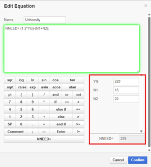 2. Use the Edit Equation window to make necessary changes. Equations can be set as active or inactive, meaning they will either be shown or hidden in Prescription Builder > Equations tab. Values can be entered into the boxes (outlined in red on the bottom left image below) to test the equation.