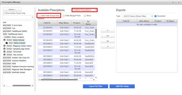 NOTE: Individual fields and field groups will be listed in Prescription Manager. Field groups can be found at the bottom of the list of available prescriptions. If the whole field group will be applied, then only the field group prescription needs to be exported. To hide the individual field parts in the field group make sure the Hide Field Group Parts is selected.