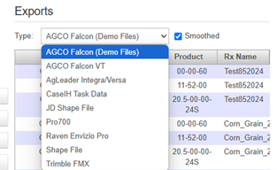 8. Choose a file type from the drop down menu above the Exports. Check the Smoothed box if a smoothed file is desired. This will create gradual changes between rates allowing for a more accurate application. Files are typically smoothed when being spread with high-speed application equipment. The Mapping Center recommends not choosing Smoothed on seed prescriptions unless you are working with a large planter with only one section.