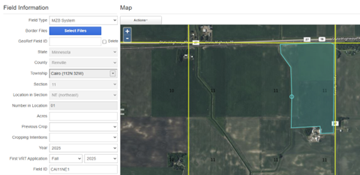 2. The Field ID is created automatically when the boxes are filled. The Field ID is the field’s unique identifier in the FieldReveal database. The Field ID can be modified by clicking in the box and entering a desired field ID. It may be helpful to turn on the Sections Layer on the Map Pane to determine the Location in Section.