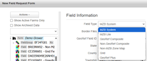 Choose a Field Type from the drop-down menu. Full MZB, MZB Lite, Non-MZB, and GeoRef Plus fields get sent to the Mapping Center for processing after the request has been submitted. GeoRef Composite, Non-GeoRef Composite, and Grid fields will be available in the Profile Selector after the request has been submitted.