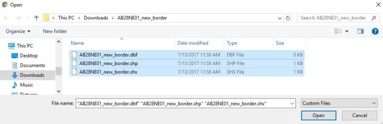 Navigate to the folder that contains the border file. Select the shapefile (.dbf, .shp, .shx) of the field border. The shapefile must be unzipped. Click Open
