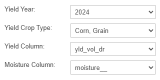7. Assign a year, crop, yield, and moisture to the yield file using the Yield Year, Yield Crop Type, Yield Column, and Moisture column dropdowns. Multiple years of yield data can be uploaded to a field.