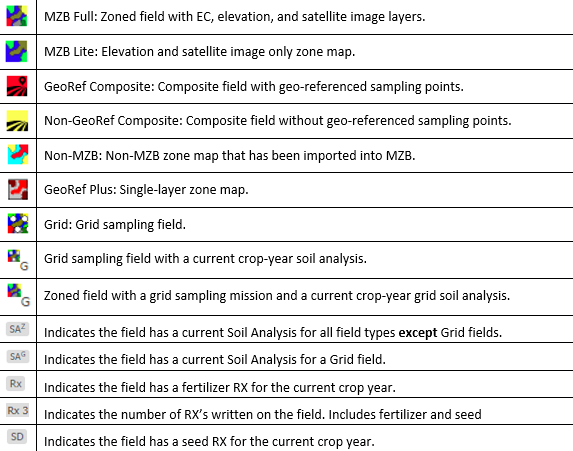 Icons in the profile selector allow users to quickly identify basic field information. A field’s map type, soil sample status, and prescription status can be identified by the icons below.