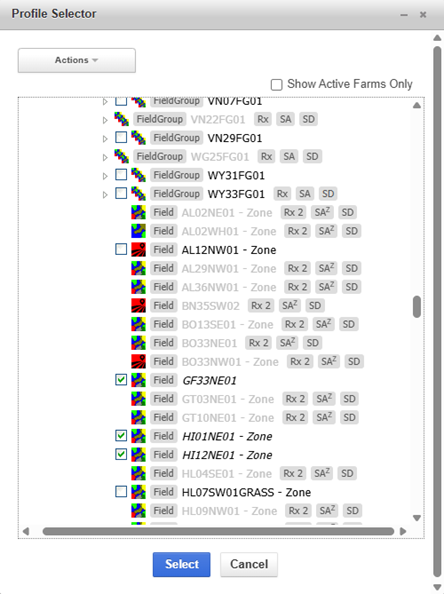 3. Navigate to the Grower and Farm. Each field or field group has a checkbox next to it. Field groups may be expanded to view their fields. Click the checkbox for fields that need to be sampled. Click Select.